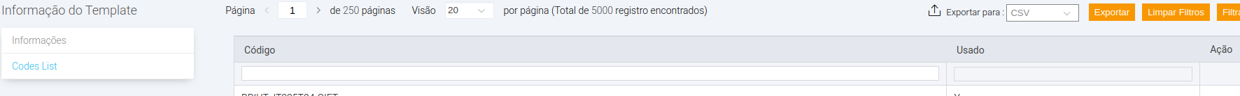 Na grade de contas de códigos de cartão-presente, você pode visualizar e editar as contas de todos os cartões-presente comprados.