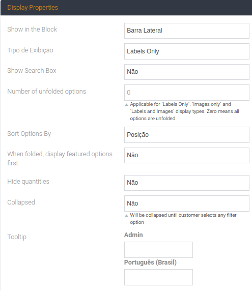 Existem várias opções para exibição de valores de filtro. Defina Imagens ou Imagens e Etiquetas para o filtro da sua marca.