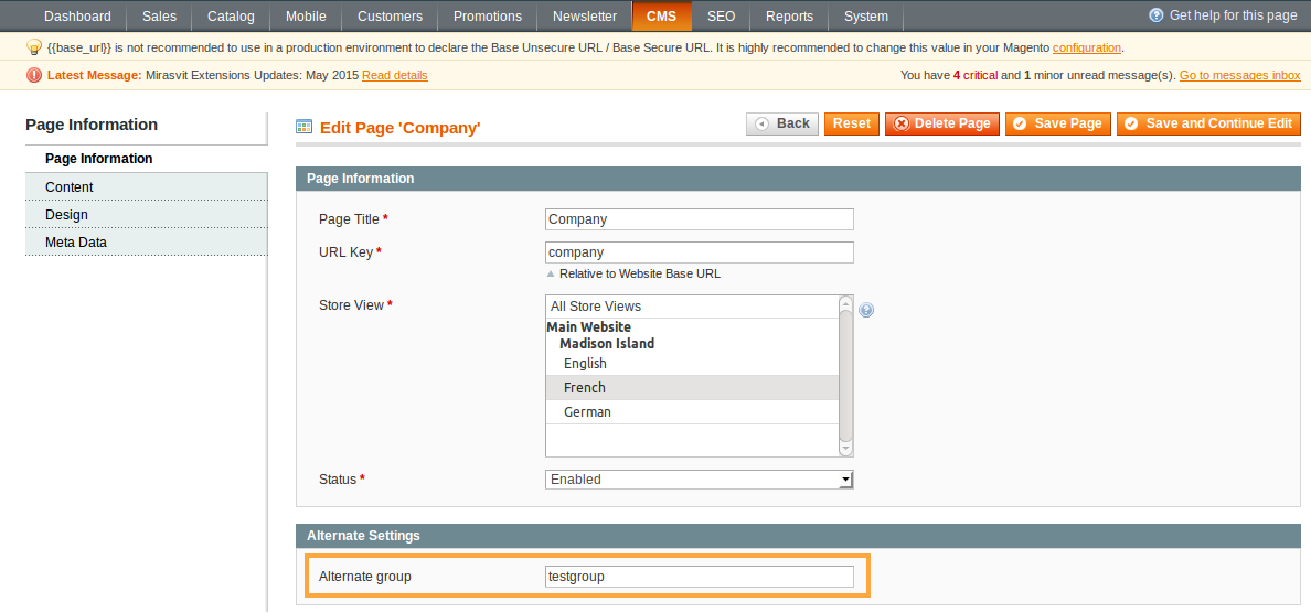 Para informar ao sistema que algumas das páginas do CMS são "alternativas", você precisa adicionar essas páginas em um grupo Alternativo . Grupo alternativo - é um parâmetro adicional que é adicionado pelo nosso módulo (pode ser usado qualquer palavra neste campo). A página CMS terá links alternativos de páginas com o mesmo nome de grupo alternativo .