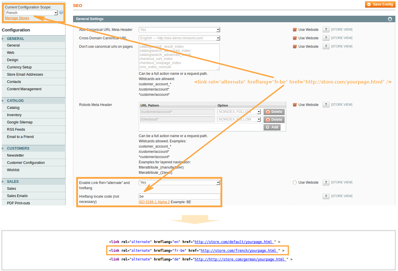 Se você tiver uma loja multilíngue, precisará configurar o segundo parâmetro "hreflang" ("idioma" do par país/idioma) para as visualizações da loja que precisam disso. Para definir o idioma apropriado para a visualização da loja, vá para Sistema > Configuração > Geral e selecione a visualização da loja necessária. Na aba Locale Options selecione Locale apropriado para esta visualização de loja e salve-o (Screenshot) . Este código de localidade selecionado será o primeiro código do parâmetro hreflang . Para definir tags alternativas e hreflang , vá para SEO > Configurações e selecione a exibição de loja apropriada onde você usa outro idioma. Desmarque o site de usona linha Enable Link Rel="alternate" e hreflang e selecione o valor Yes na lista suspensa. Após esta ação, aparecerá um novo campo: Código de localidade Hreflang (não necessário) onde você pode definir adicionalmente o código do idioma que será adicionado à URL alternativa como um segundo parâmetro. Como exemplo, você pode ver um padrão para os links do French Store View: