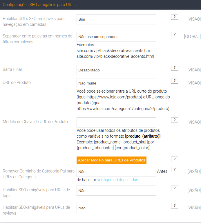 Modelo de chave de URL do produto - permite definir o modelo de chave de URL para páginas da loja.