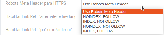 Exemplos:*cell-phones* INDEX, NOFOLLOW *cell-phones/nokia-2610-phone.html NOINDEX, NOFOLLOW customer_account_* NOINDEX, NOFOLLOW /customer/account/* NOINDEX, FOLLOW *?mode=list INDEX, NOFOLLOW Examples for layered navigation: filterattribute_(manufacturer) INDEX, NOFOLLOW filterattribute_(1level) NOINDEX, NOFOLLOWRobots Meta Header for HTTPS - permite adicionar cabeçalhos como "NOINDEX, FOLLOW", "INDEX, NOFOLLOW", "NOINDEX, NOFOLLOW" apenas para a loja https.