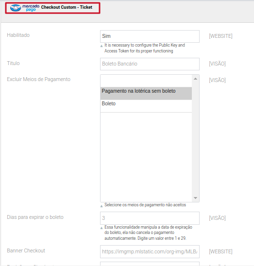 Habilitar/desabilitar e inserir as informações, marcar para excluir o pagamento na lotérica sem boleto (desuso)
