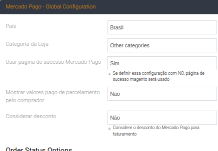 Global Configuration - Selecione o País. usar página de sucesso do MP