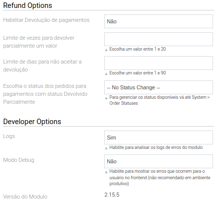 Opções de Reembolso - Para habilitar, definir limite de vezes para devolver parcialmente o valor, limite de dias para não aceitar a devolução e selecione o status para pedidos com Status devolvido Parcialmente.