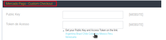 link para pegar as credenciais: https://www.mercadopago.com/mlb/account/credentials - public Key e token ou caso prefira, siga o tutorial de criação das credenciais Aqui.