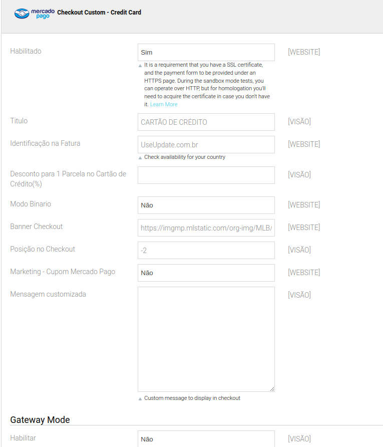 Cartão de Crédito - Habilitar/desabilitar e inserir as informações, temos a opção de desconto para a 1 parcela
