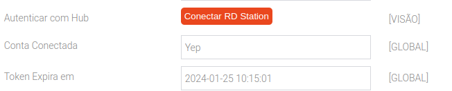 Assim ao Salvar lhe será disponibilizado o botão "Conectar RD Station" em Autenticar com Hub. Basta precisar com a autenticação que o processo será efetuado com sucesso e sua conta da RD Station estará conectada à plataforma Yep.